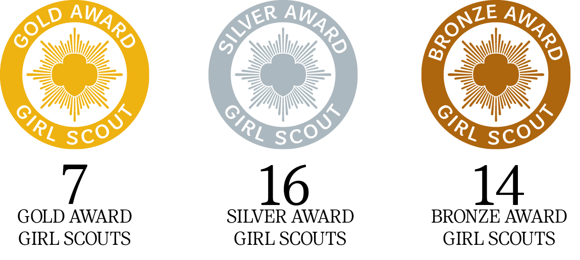 Seven remarkable Girl Scouts were recognized in March 2023 for their Gold Award projects. Our Gold Award Girl Scouts spent more than 1000 hours creating, renovating, developing programming and, most of all, implementing sustainable and lasting impacts in our communities. Our Girl Scouts changed the world.